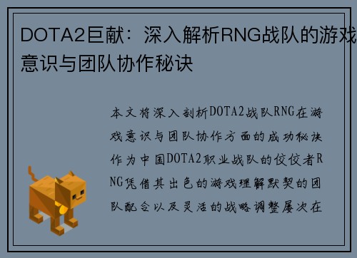 DOTA2巨献:深入解析RNG战队的游戏意识与团队协作秘诀